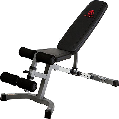 Sporting Goods/Adjustable Weight Benches/11 : This Marcy utility bench allows for multi-position back pad adjustment (incline, decline, flat) using an easy pop-pin slide track. This bench will adapt to use with most squat racks, half cages, and Smith machines. The seat and back are constructed from top-grade, high-density foam with boxed upholstery for years of comfortable use.2″ x 2″ heavy-duty steel tube frame. Durable, powder-coated finish. 8-position back pad adjustment (military, incline, flat and decline)