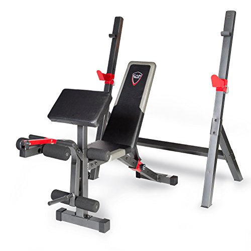 For the experienced lifter! the cap strength Olympic bench features a sturdy frame design, durable construction, and easy assembly. The bench is built with a dual-function, 6-roll leg developer, detachable squat station, multi-position adjustable uprights, safety spotters, and not to forget the flat, incline, and decline positioning bench. Perform bench presses, squats, and leg extensions, all with one unit, for an incredibly versatile workout session. Oversized tubing, black powder coating, and premium upholstery makes this bench a solid choice for a Great workout. This bench accommodates 7-foot Olympic bars with a weight capacity is 500 lbs. (User + weight). sturdy frame design, durable construction, and easy assembly. Dual-function 6-roll leg developer, detachable squat station, and multi-position adjustable uprights. Safety spotters with a flat, incline, and decline position bench. Oversized tubing, black powder coating, and premium upholstery. Accommodates 7-ft. Olympic bars.Dual-function 6 roll leg developer, preacher pad, detachable squat station, multi-position Adjustable uprights, safety spotters and a flat/incline/decline position bench